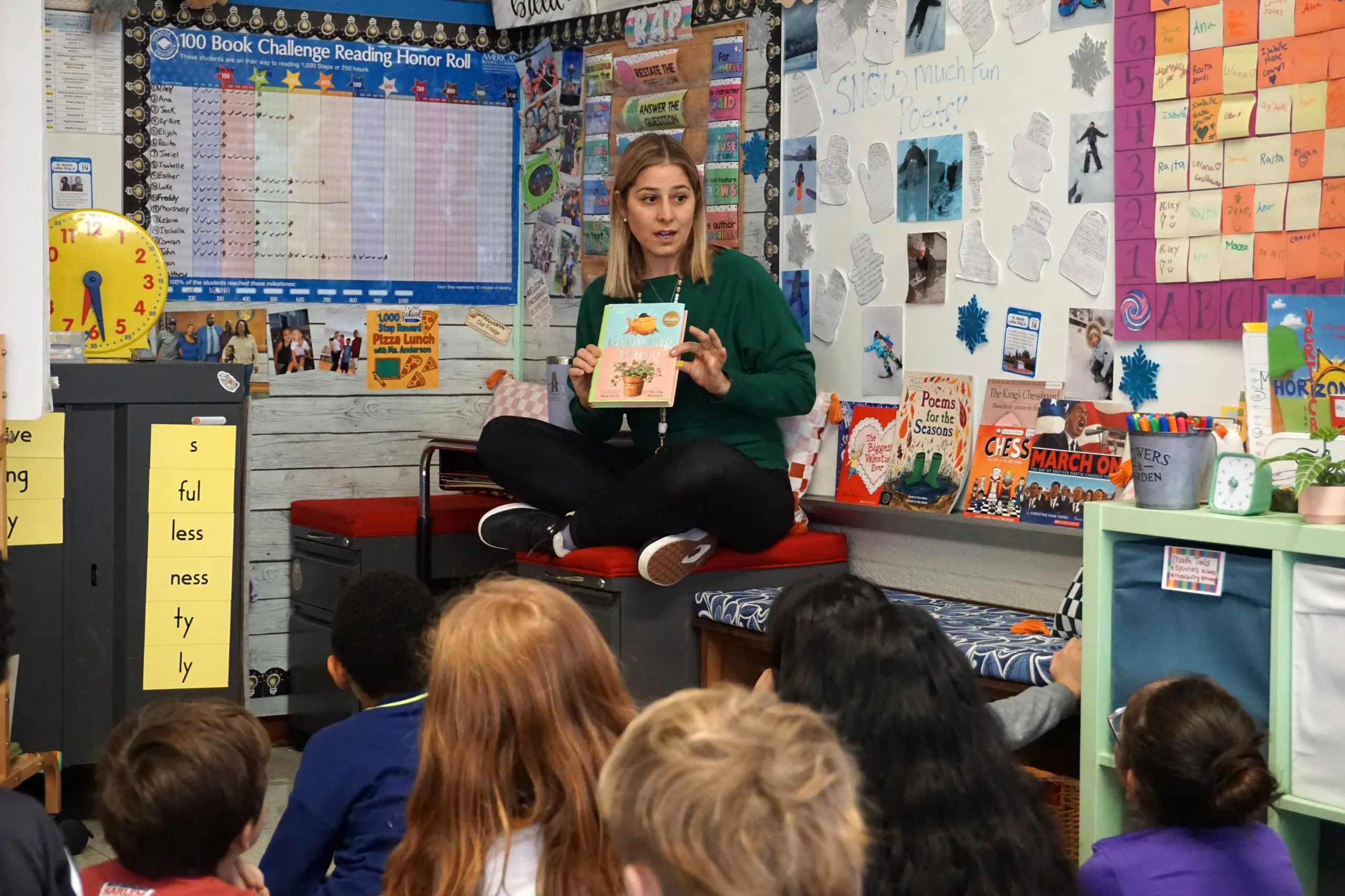 In Anderson’s classroom, school-issued devices are tucked away in a cart that is often hidden by a large paper easel and barely touched by students. The shelves in the back of her room are overflowing with books, board games and Legos. Break time features games like hopscotch, and students who are not working with Anderson during small-group time play chess or with math cards.